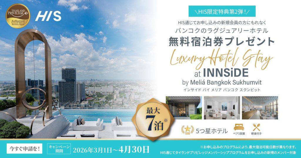 2025年11月1日から12月24日までHISを通じてタイランドプリビレッジプログラムをお申し込みの新規会員の方にバンコクのラグジュアリーホテル無料宿泊券をプレゼントいたします。