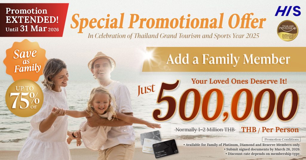 To celebrate the Thailand Grand Tourism and Sport Year 2025, Thailand Privilege Card Co., Ltd. introduce a special promotional campaign designed to encourage more families to enjoy long-term residency in Thailand under our premium membership tiers.