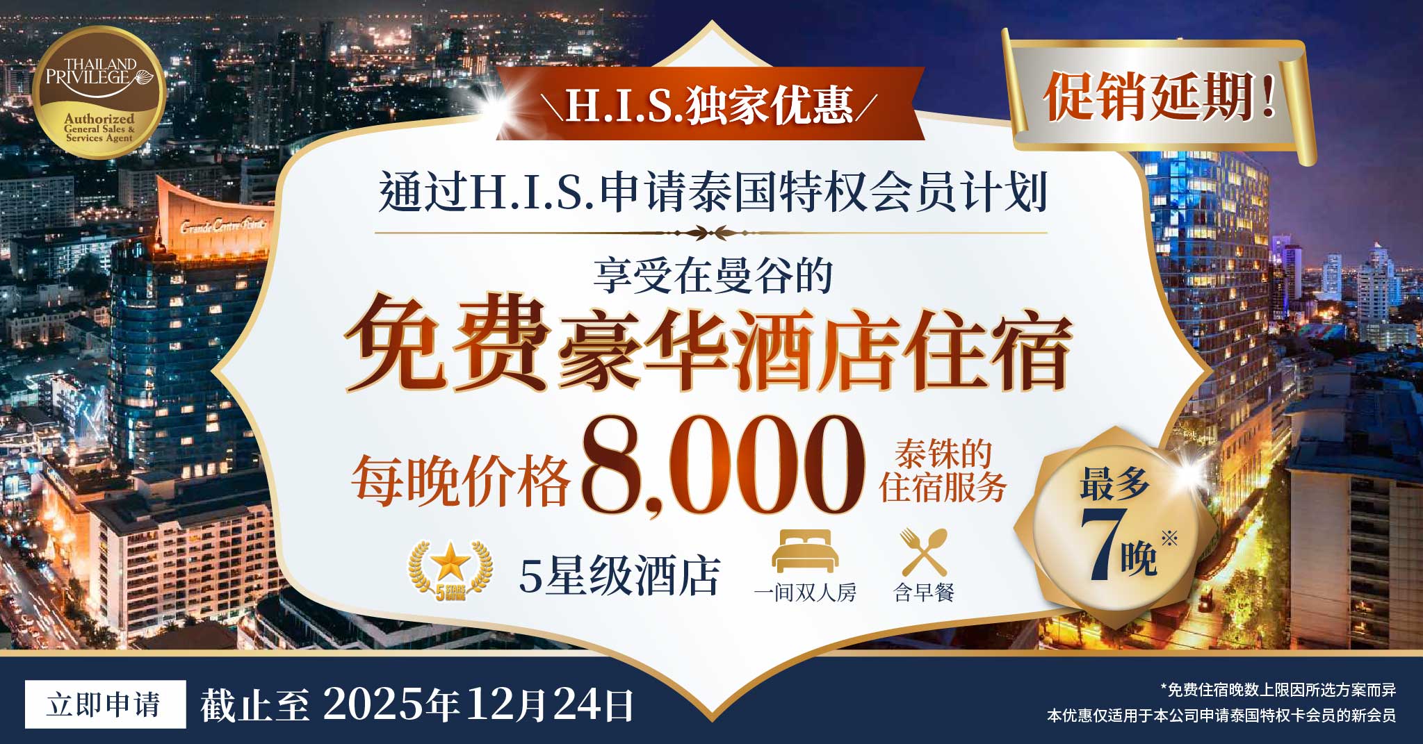 于2025年8月1日至10月31日期间,享受H.I.S. 泰国特权。
