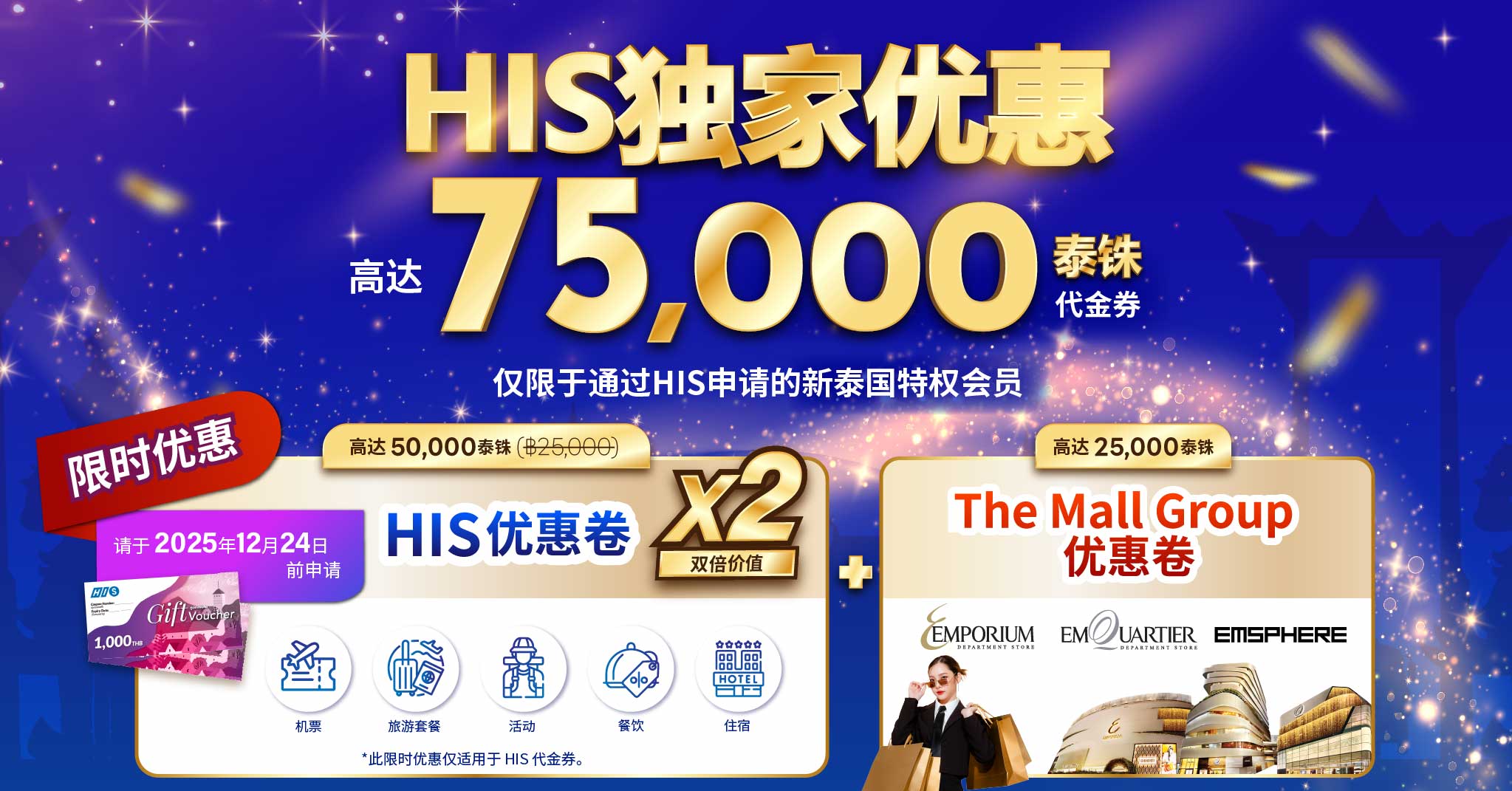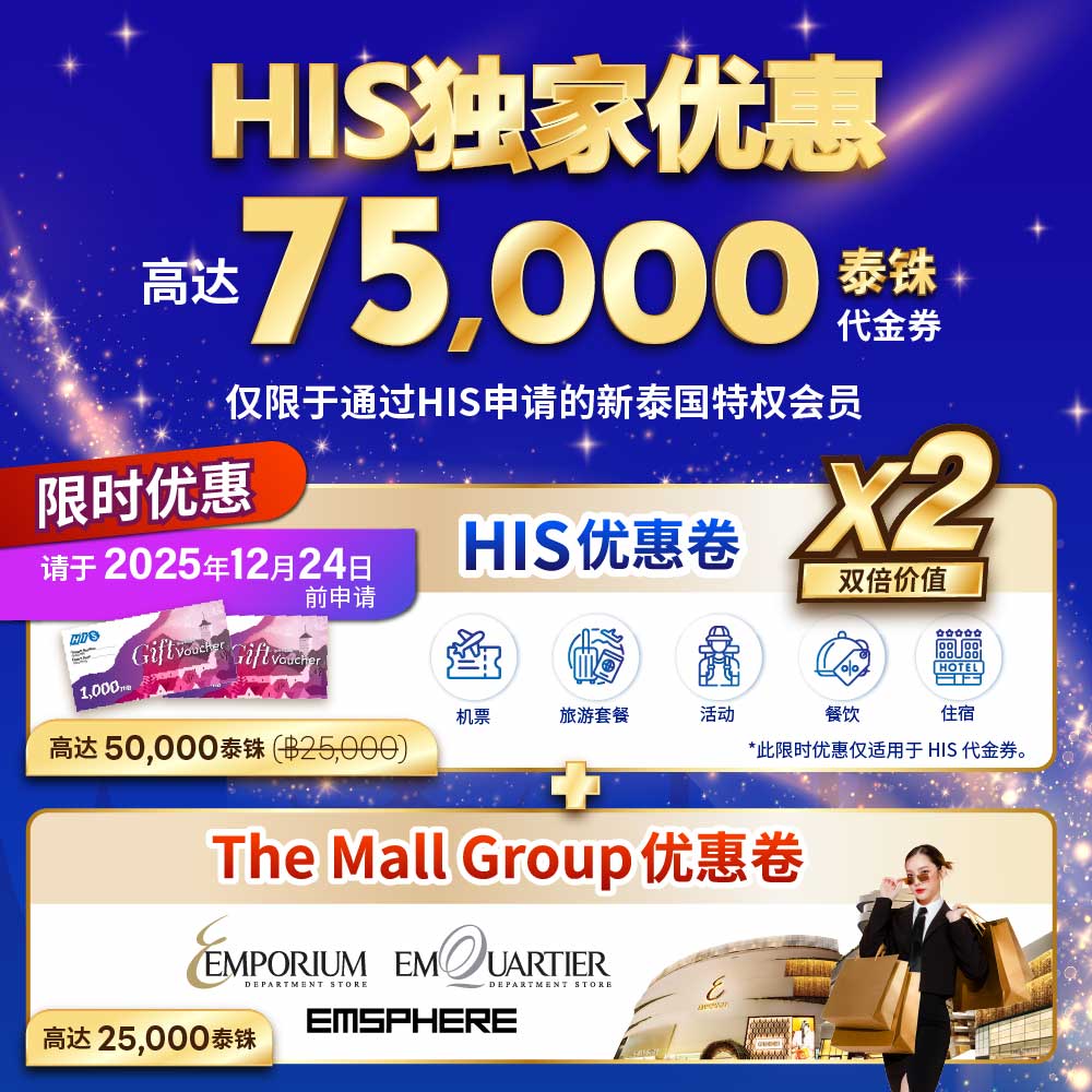 于2025年8月1日至12月24日期间,享受H.I.S. 泰国特权。